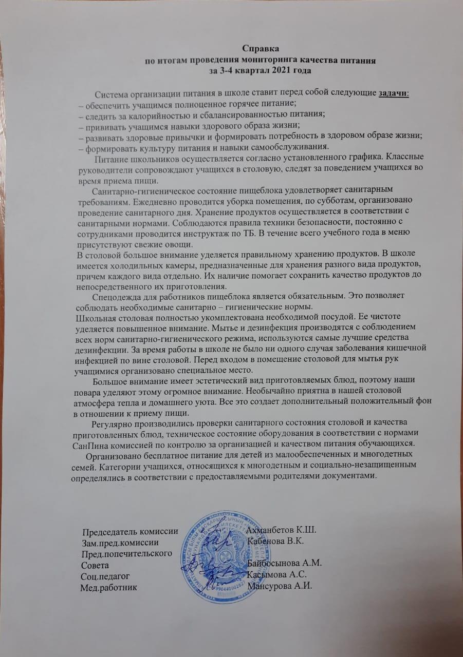 28 желтоқсан 2021 0 1 2 3 4 5 Справка по итогам проведения мониторинга качества питания 3-4 квартал 2021 года за
