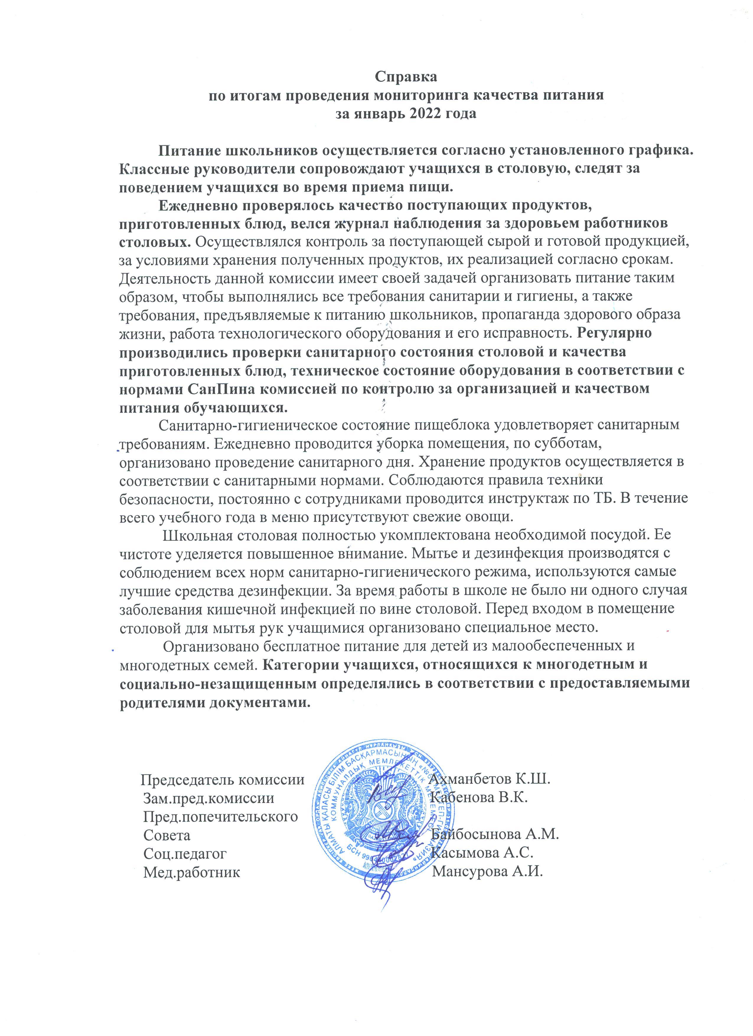 05 наурыз 2022 0 1 2 3 4 5 Справка по итогам проведения мониторинга качества питания за январь 2022 года