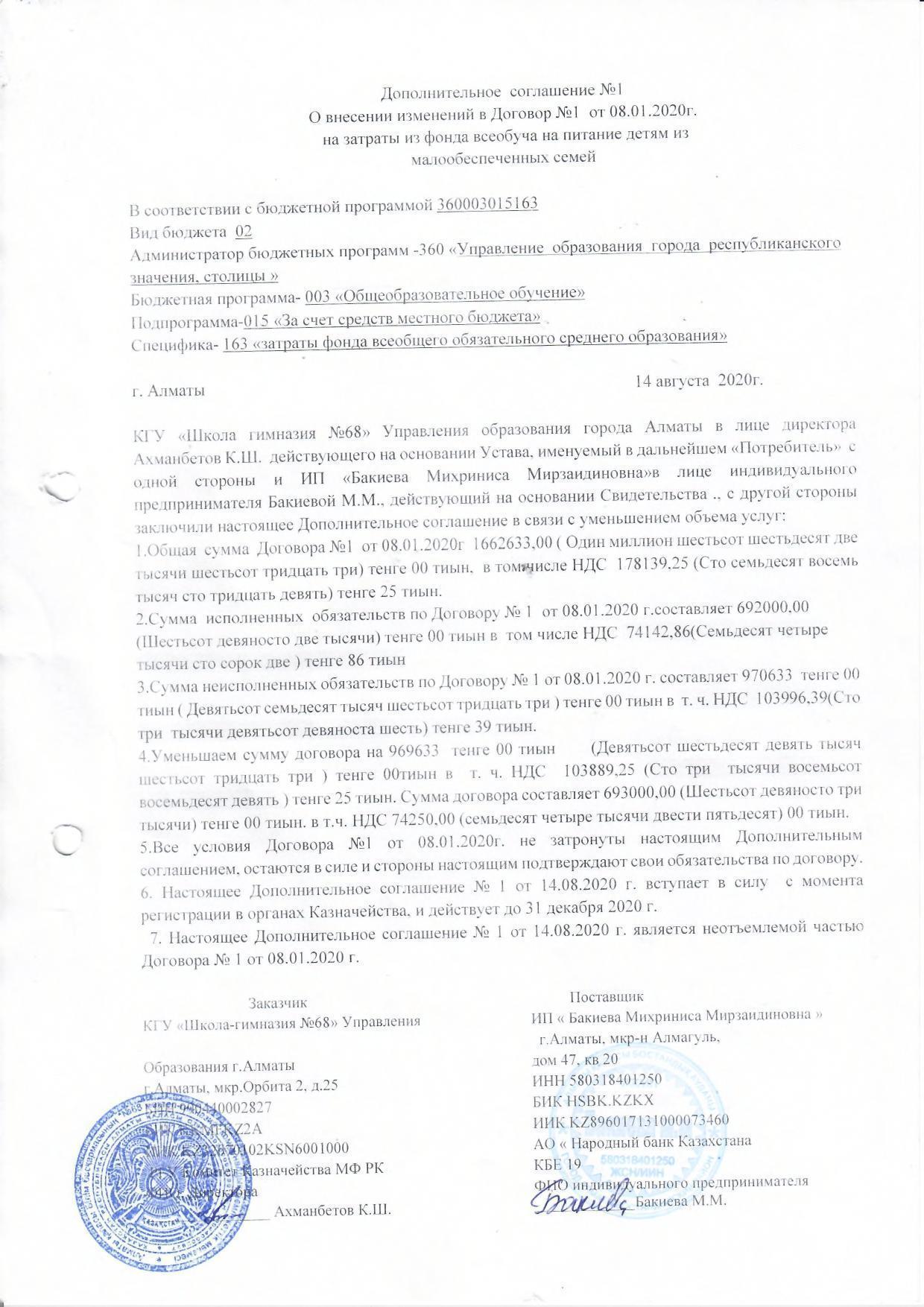 » Бюджеттік бағдарламаға сәйкес қоғамдық тамақтандыру шарты 2020